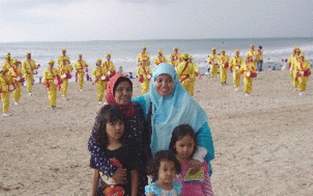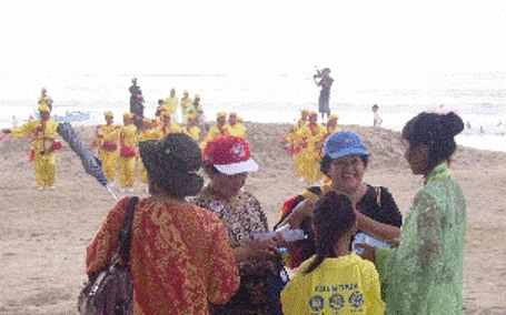 当众多的游客还在感受着大海带来的汹涌澎湃时,在海边悄然出现了一群宁静祥和的炼功人,时而祥和的打坐,时而做着缓、慢、圆的动作,如此的超然与自在。长期生活在紧张快速的现代生活节奏下的人们立刻被强烈的吸引,或是用手中的相机拍下这完美的画卷;或是坐在沙滩静静的欣赏;或是与法轮功学员交谈以了解他(她)们如此祥和的原因。