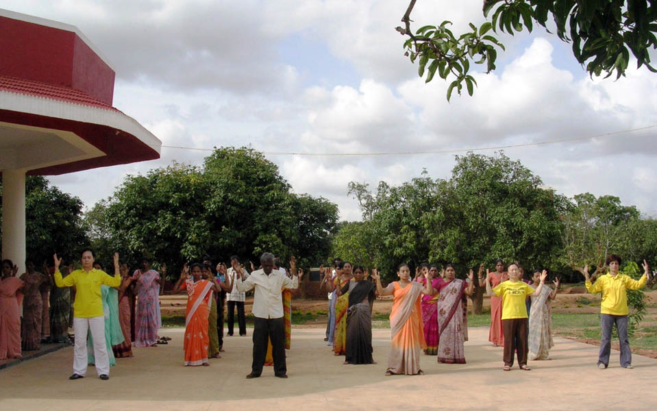 走了一个多小时的路程来到Byreshawara学校,校长Mr. Sri Ram Reddy已等候多时。抵达后,学校广播请学生来操场集合,接着集体炼功。这些学生在体育课都炼过法轮功,所以动作都挺标准的。在短暂的三十分钟后,又换另一批学生出来炼功,因为学生实在太多了,只好分段作息。
