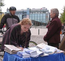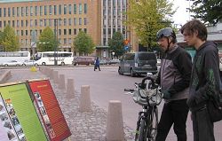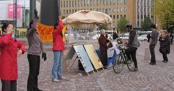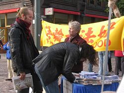一位骑车的男士途径法轮功学员的讲真相点时,主动停下来索要真相资料。他对学员说,他知道法轮功,想更多的了解法轮功。学员姜女士给他讲了自己从九五年开始修炼法轮功身心受益,但中共九九年开始打压这些信仰真善忍的好人。自己二零零一年来芬兰看女儿,三个月到期要返回时,国内的朋友和家人却说千万别回来,国安已到原工作单位和老家去调查了,并威胁和监控她八十多岁的老母亲。结果前年母亲去世,自己都无法回去为老母亲送终。姜女士给这位先生指点了法轮功的网站地址,告诉他可以在上面阅读法轮功的书籍和相关资料。他接着又询问了赫尔辛基的炼功点地址,最后说:“看来中共怕法轮功。”
