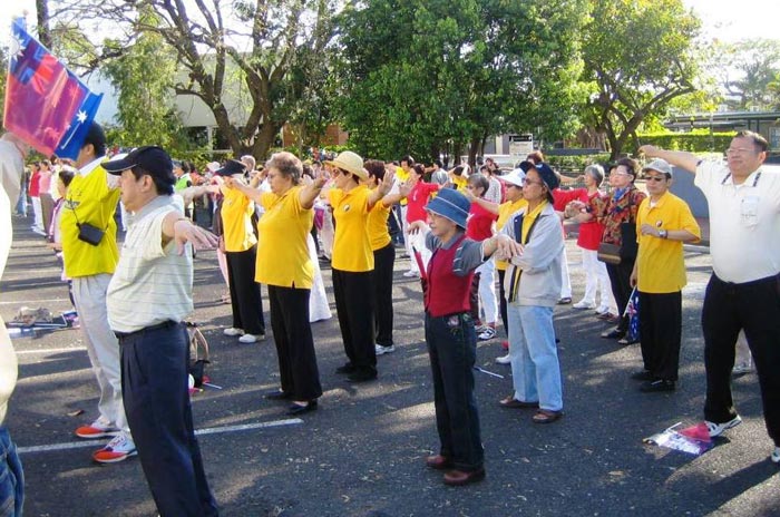 身穿黄衣服的法轮功学员们一边向民众展示着功法,一边介绍功法的特点。现场无论是中西方的民众,或是老人小孩都自然而然跟着学炼起来,政要们也加入了清晨炼功的行列。原本喧闹的广场上,顿时散发出平静祥和的能量。
