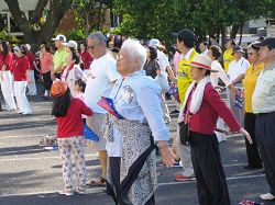 升旗典礼前,昆士兰台侨团体联合会会长柯文耀先生邀请当地法轮功学员们在广场上展示法轮功第一套功法。他向现场民众表示,法轮功是个极好的功法,修炼者人人身心健康,并建议民众都来学炼。
