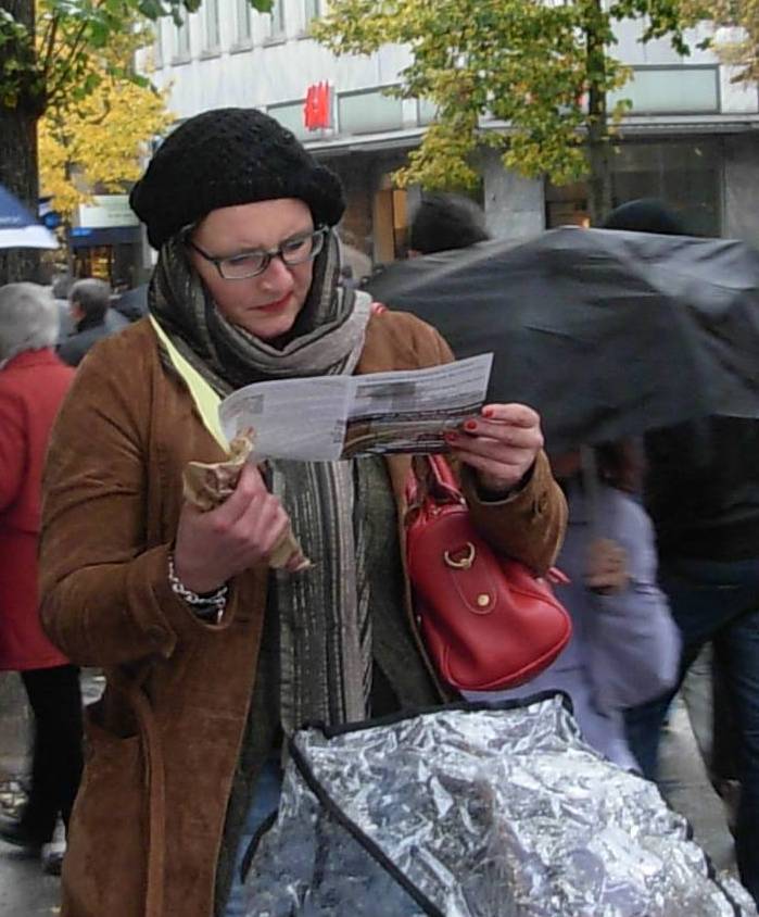 因为她有亲戚在当年的东德,所以对于中共现在的暴行她并不陌生,她也了解为什么中共不愿人们有自己的信仰,不允许人们按照“真善忍”的准则生活。在得知已经有四千三百多万中国人退出中共及相关组织时,她高兴的说:“这是希望,这是很大的希望。”因为前一天正是德国的国庆,也是东德,西德统一的纪念日,因此她看到了介绍一位原东德的牧师长期默默为德国和平统一祈祷的故事。她谈到这位牧师表示,只要有一颗小小的种子就会有改变的希望。她认为,现在的退出中共的活动就象那种子一样,能使中共解体,是中国的希望。最后她高兴的拿走了《·九·评*共产党》,并祝愿法轮功学员好运,成功。