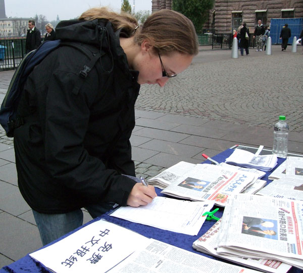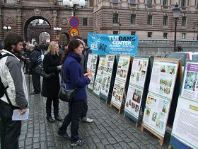 不大一会,他又转了回来问法轮功学员张女士在哪里能买到法轮功的书籍。原来这是一位刚刚从中国大陆来到瑞典乌普萨拉一所大学里上学的留学生。他对张女士说:“我就是想要看看有关法轮功的书籍,但是在国内一直也没找到。”张女士将法轮大法网站的网址、以及自己的联系电话都给了这位年轻人,并告诉他如果今后需要帮助,随时可以联系她。这位年轻人很高兴。