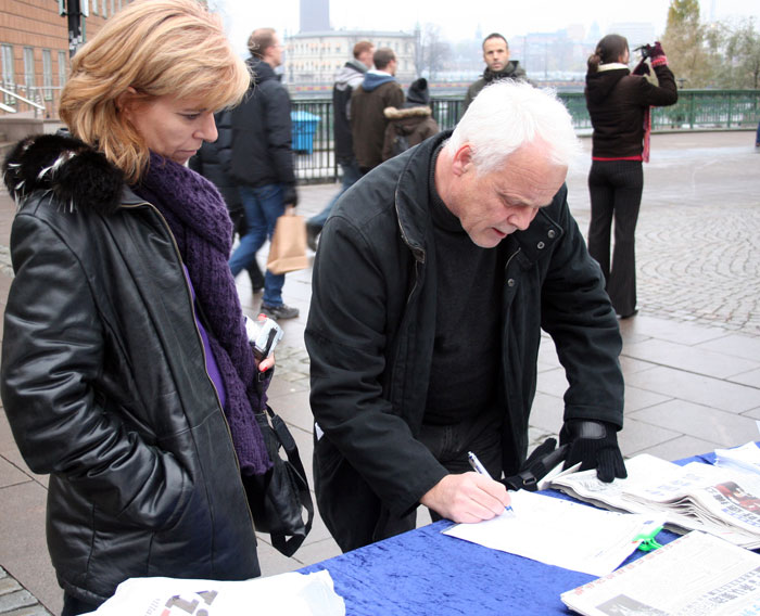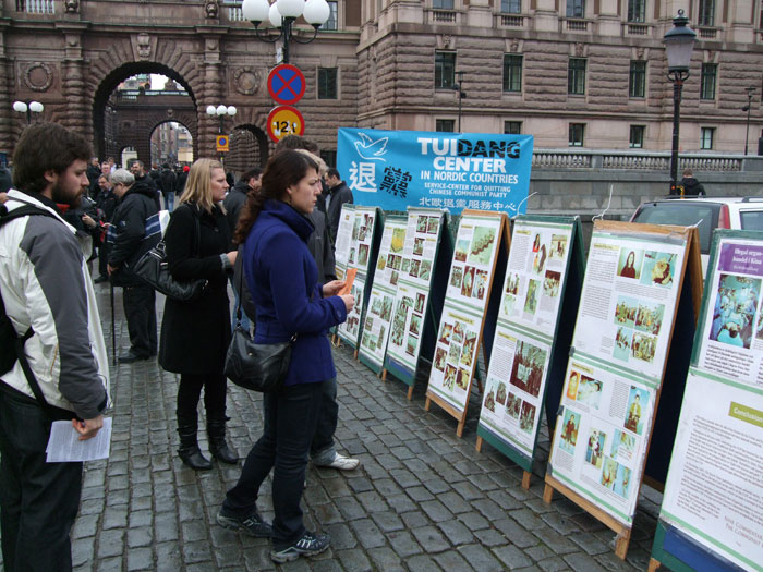 这时一位不知何时站到他们旁边的中年男子听到这儿,忍不住插话说:“你说的一点也没错,我的一位好朋友的两位亲人前段时间就被他们抓进去了。我认识他们,他们都是非常好的人。”说到这儿,他控制不住自己,声音哽咽着说不出话来,接着他说:“瑞典不愧是个真正民主的国家,今天我看到你们在这里搞这个活动。我很感动,还是民主国家好啊!人们可以自由的表达自己的愿望可以有自己的思想和意见并受到保护。法轮功真的很了不起,只有你们敢于和中共暴政抗衡。我敬佩你们!没有你们,它们迫害无辜的好人更肆无忌惮了!我很同情我的朋友,不知道怎么能帮助他们;我也被中共恶党迫害……”接着他又哽咽着说不出话来了。