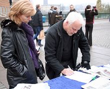 一位经常路过此地的瑞典老人看到学员拍拍学员的肩膀,很高兴的说:“你们的事情我都知道了,我已经签过名了。”