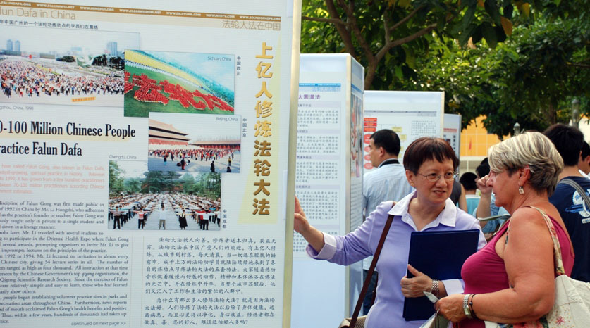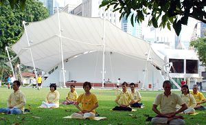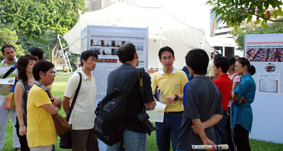 学员们在草地上展示了十几块图文并茂的立体展板,概述了法轮功洪传全球的概况、在新加坡的发展历程、各国政府对法轮功的褒奖以及中共迫害法轮功的残酷事实。在展板的另一侧,十几位学员列队演示法轮功五套功法。伴着柔和悦耳的炼功音乐,几名学员在展板旁边向观看的民众细心的补充介绍并且回答他们的提问。
