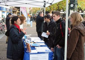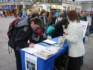 一位来德国旅游的中年女士告诉学员,令人难以置信,世界上居然还有活体摘取器官出售的罪恶。她说她两天后就要去挪威了,她要告诉她的家人、朋友关于发生在中国的迫害。她说她要上传单上给出的网址,详细了解法轮功是什么,为什么中共这么残酷的迫害法轮功。她希望法轮功学员坚持下去。