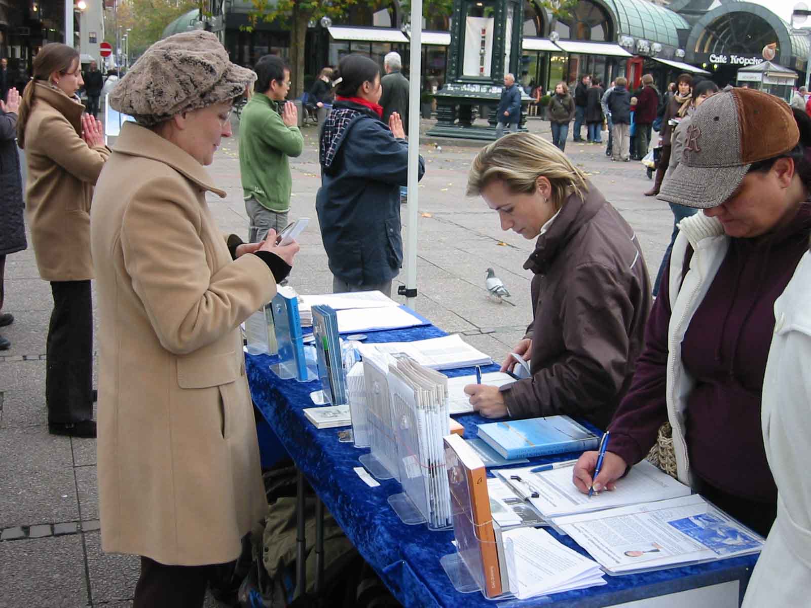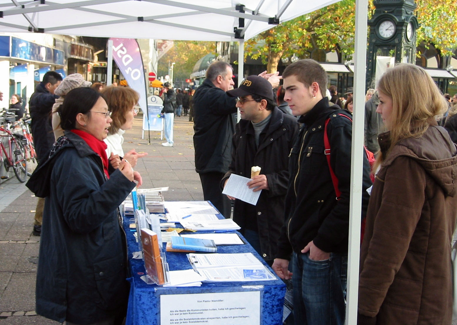 一位来自伊朗的中年人在摊位前呆了很长时间。他详细了阅读了法轮功遭中共迫害的真相小册子。他说:在这个世界上,每个人都有权利按自己的方式思考问题,按自己喜欢的方式生活,这种权利不允许被哪个政治制度和政治家所左右。他非常同情中国法轮功学员所遭受的痛苦。他说,伊朗霍梅尼时代他就来到了德国,他深知自由的思想对一个人有多重要。