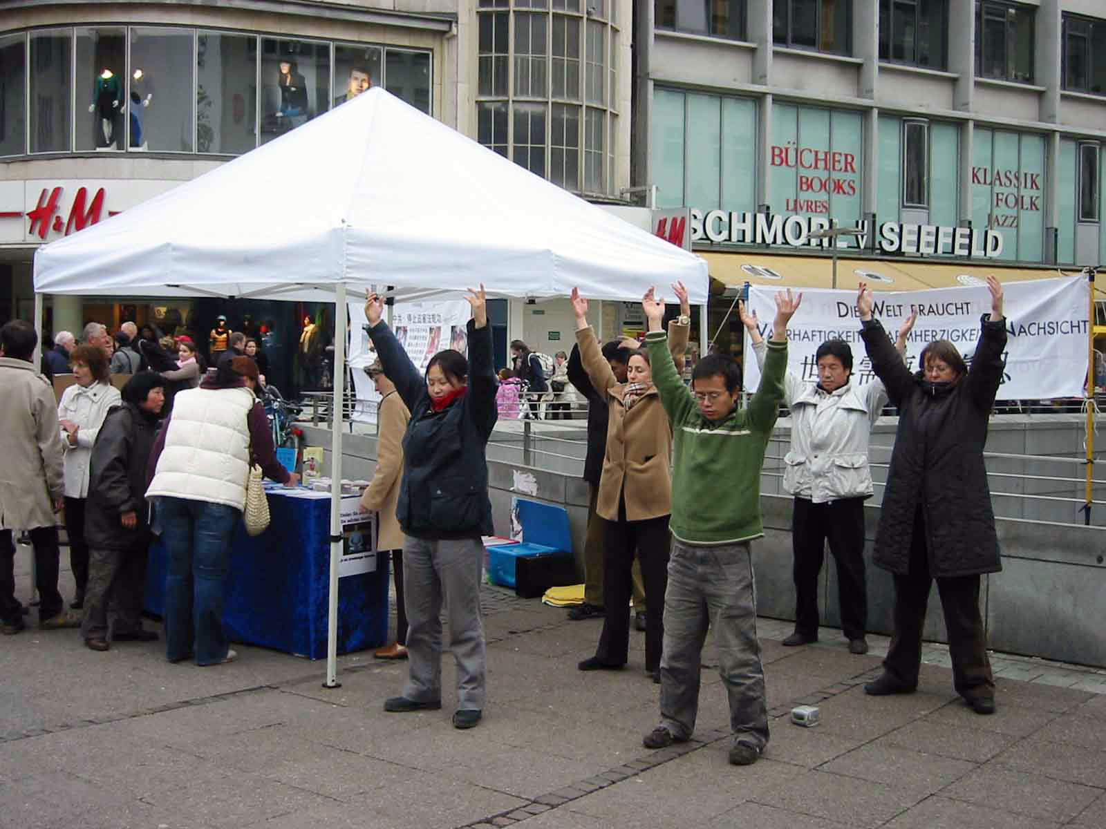 信息日到傍晚快结束时,摊位上来了一个华人,告诉学员她是台湾来的,几年前嫁到德国,她说她在台湾的姐姐就是法轮功学员,曾多次对她说法轮功好,建议她学炼法轮功。她说她只在家里照着录像学了动作。不知道是否标准。希望汉诺威的学员能帮助她纠正炼功动作。