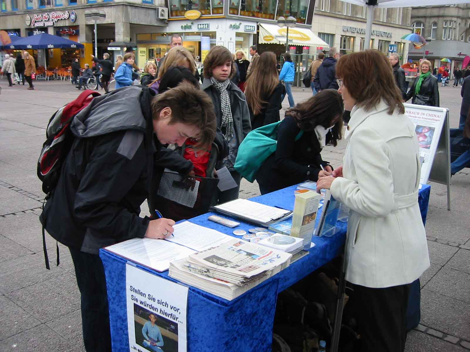 周六的吕佩克广场,逛街购物的人熙熙攘攘,法轮功摊位旁常常站满了人驻足观看。当看到法轮功学员被中共活摘器官的图片展览时,许多人非常震惊和愤怒。到摊位前签名声援法轮功的人络绎不绝。许多人签完名字后向法轮功学员询问迫害的详情。