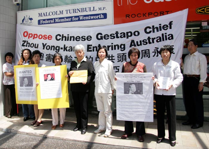 法轮功学员代表指出,澳大利亚政府不应该邀请这样一个人权罪犯来澳洲访问。周永康是迫害法轮功的四大元凶之一,犯有酷刑罪、群体灭绝等罪行。他在中国直接积极参与迫害法轮功学员以及其他宗教信仰者,导致许多法轮功学员因遭酷刑被折磨致死、致残。迫害已经持续九年,目前仍未停止。