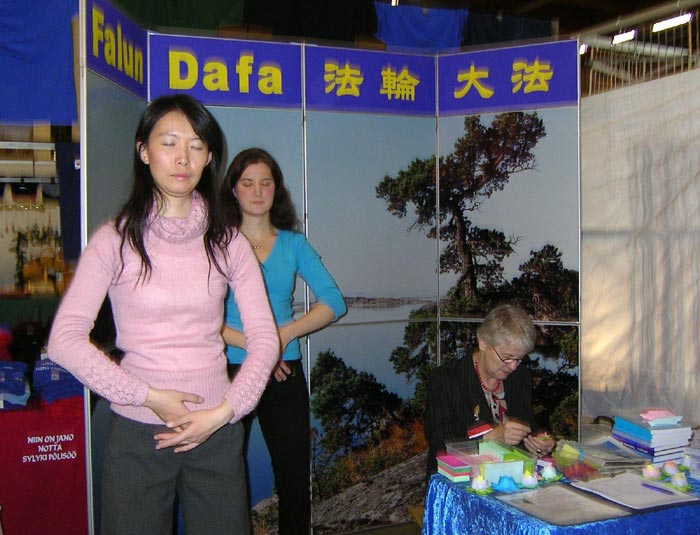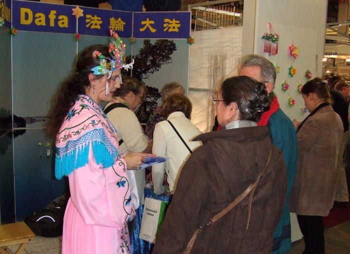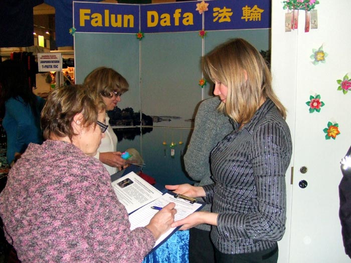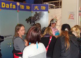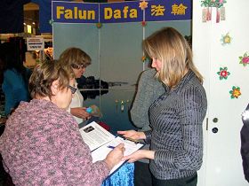 法轮功学员在摊位里演示法轮功功法,吸引了来往参观者驻足观看,许多人上前索要当地炼功点的地址。学员们将事先印好的炼功点的地址都发光了,只能一个一个给他们写在纸上。更多的人在了解到这场迫害后,主动签名支持法轮功制止迫害。