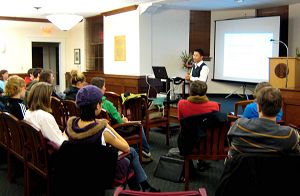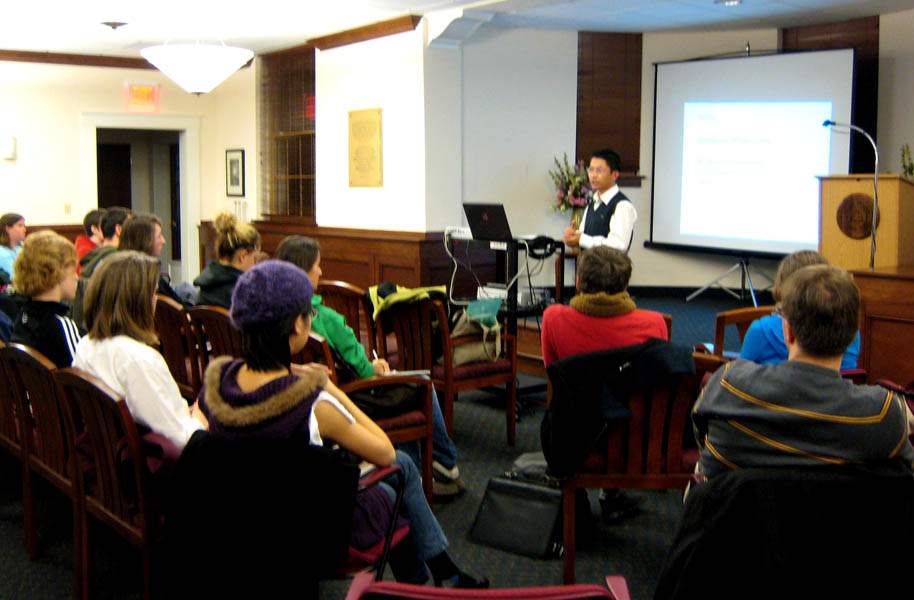 ![]() 黄奎正在给俄州海勒姆学院的师生讲述法轮功真相 |