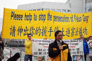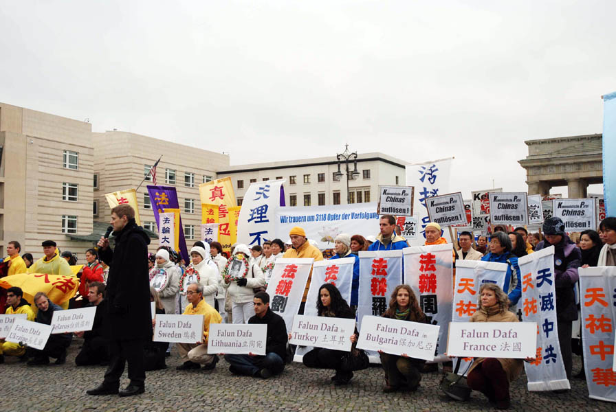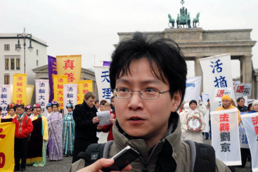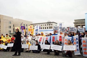 十五日中午十二点整,游行队伍聚集在亚纳维兹桥(Jannowitzbruecke)上的中领馆前,欧洲法轮大法协会主席吴先生在发言中表示,法轮功使上亿人身心健康,对法轮功的迫害实质上是中共邪恶本性使然,是对全人类的迫害。