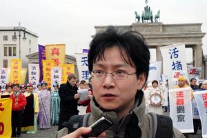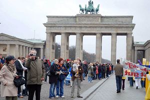 一对中国夫妇在布兰登堡前看热闹。这位妻子向记者表示:“法轮功了不起!我不是法轮功学员,但是这些年来我看着他们做的很多事,我觉的真是……今天的集会太好了,那么大型的活动,我都感动的忍不住哭了。我觉的这样的热闹应该有更多的中国人来看,用自己的眼睛看看到底发生了什么。”她还告诉记者,她会把她在国外看到的告诉国内的亲友。 她以前就这样做,但她认为那还不够,以后她会做更多。
