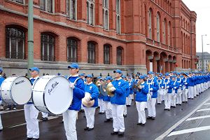 游行由来自欧洲各国一百二十人的天国乐团开道,蓝衣白裤在灰色的天空下分外鲜明。紧随其后的横幅队,“法轮大法好”、“真善忍”等横幅默默传达大法弟子的心声。腰鼓队金衣闪闪,唐装舞和彩车花团锦簇,展示中共酷刑手法的游动车则直白讲述迫害的残酷。