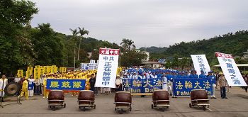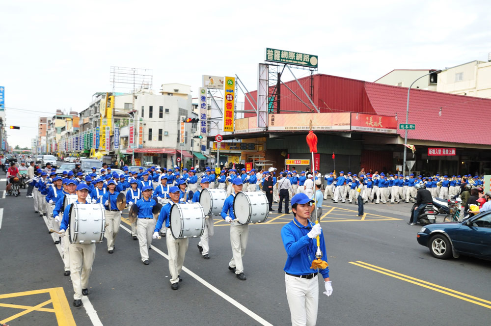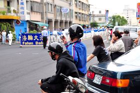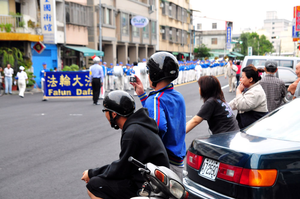 一位女士从自家三楼窗户向下大声拍手呼喊:“加油!加油!好!”很多人拿出相机来捕捉这市街难得见到的壮观队伍,更有民众热情的挥手、竖起大拇指称好。一位路人对正在发放资料的法轮功学员建议:这样的阵容到台北再游行一次会更好!一位同样是被鼓乐声吸引出家门的老先生赞许的说,就是要这样多的人、这样的气势,站出来发声,不必用暴力,大家就都知道你的诉求,知道法轮功被迫害的事。