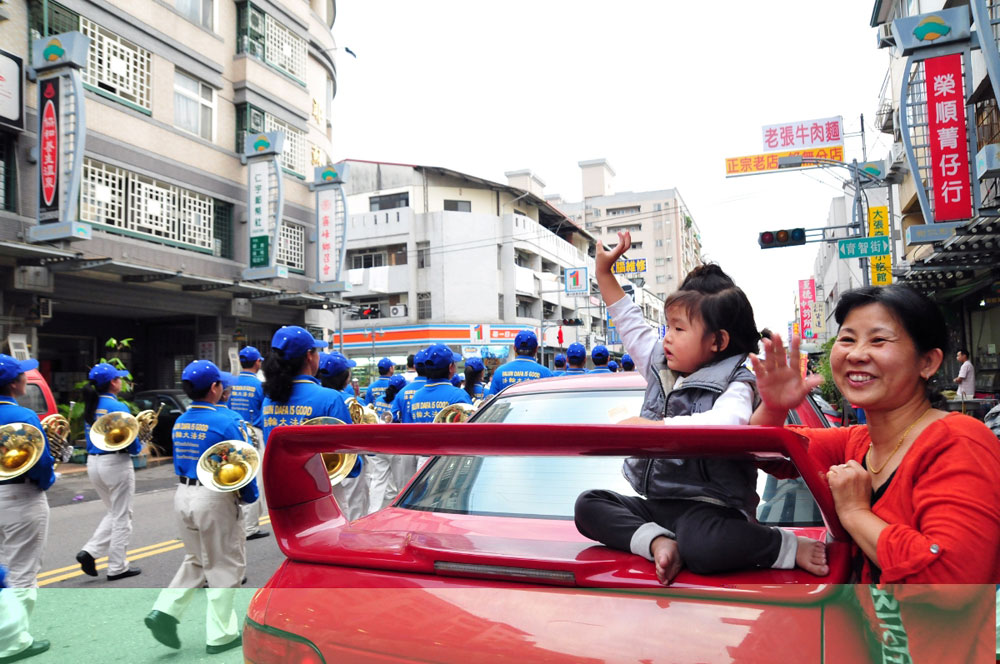 ![]() 民众挥手欢迎天国乐团的演出 | ![]() 热情民众停车拍照游行队伍 |