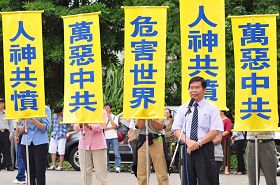 ![]() 集会主持人亚洲大学教授侯念祖发言时强调,退出中共组织是和平解体中共的唯一方法,中共解体两岸和平才能真正到来。 |