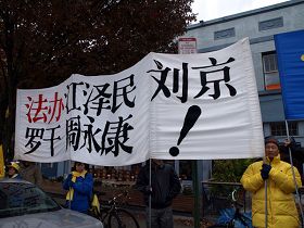 ![]() 法轮功学员在胡入住的酒店外炼功 |