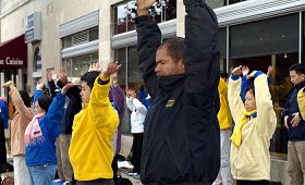 十六日,华盛顿一夜之间气温骤降。从早七点到中午十一点半,近百名法轮功学员在胡入住的万豪(Marriott)酒店外持续炼功、静坐。宁静、祥和的场面吸引了过往的行人,很多人主动向法轮功学员索要真相资料。中共使馆花钱组织的送行人群也凝神观望法轮功学员炼功,有的拿起相机拍照。