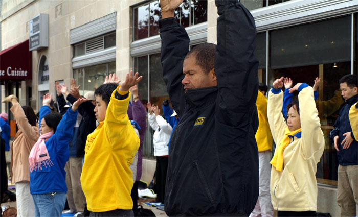 从外州来华府探亲的萨拉女士在法轮功学员面前停留了很久,并拿出相机拍照。她说,这是她第一次亲眼目睹法轮功学员炼功的场面。
