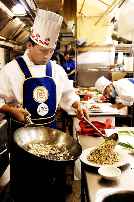 ![]() 中国菜的特色是“色、香、味、形”,还讲究刀功和火候;选手们正在用心做菜。 |