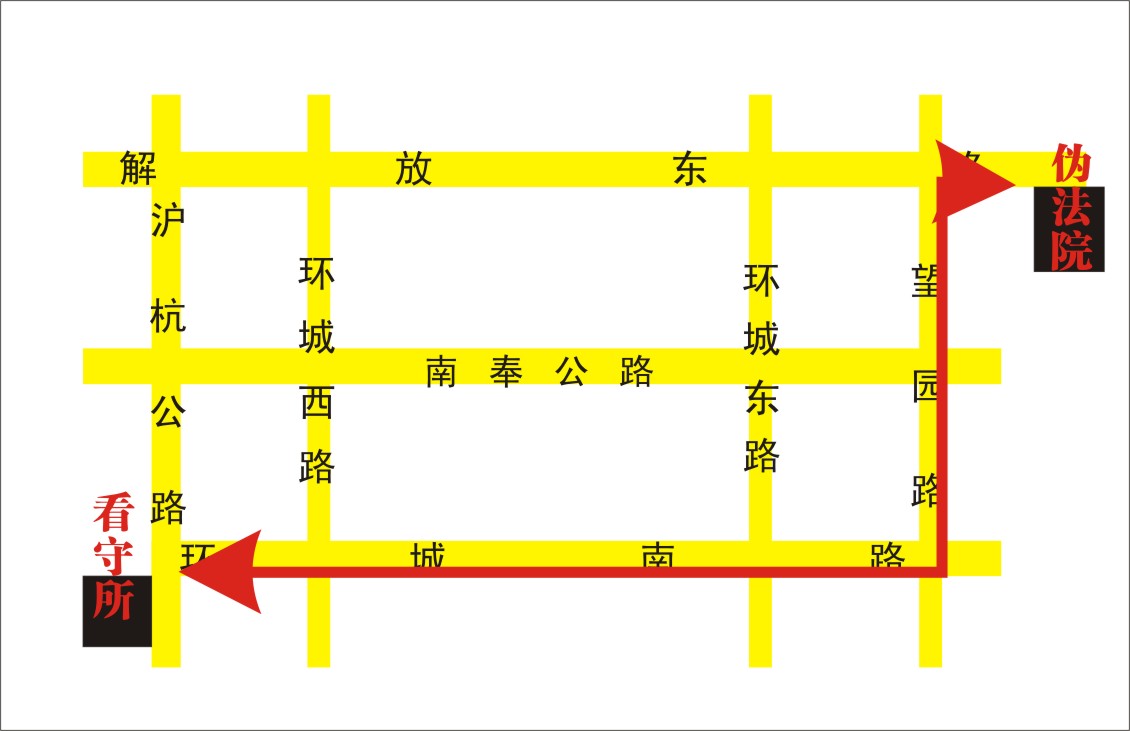 ![]() 车子的行车路线为:奉贤看守所,环城南路,望园路,解放东路,奉贤区法院。 |