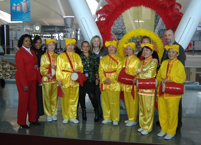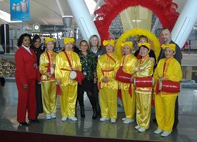 ![]() 机场工作人员和法轮功学员们合影留念 |