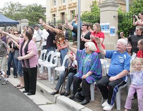 ![]() 主席台上的贵宾们对法轮功队伍报以热情的掌声 |