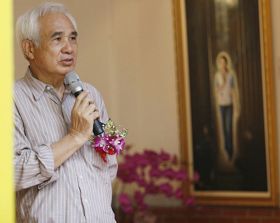 台大新闻研究所教授,同时也是新三才文化协会理事长张锦华,也代表主办单位致词。张锦华表示,现场不收钱也不卖画,因为每一幅画,都是法轮功学员用灵魂,用全部的生命,和大家分享一个个修炼人的故事。