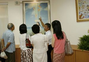 ![]() 前国立台湾师范大学艺术学院院长张清郎教授(戴帽者)前来观画 |