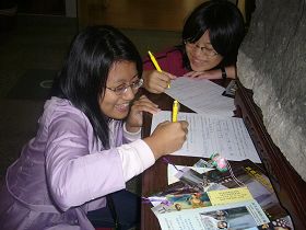 ![]() 就读高中的陈又华(右)和好友杨舒涵(左)看完美展后很认真的填写意见调查表。(摄影:林巧蓉) |