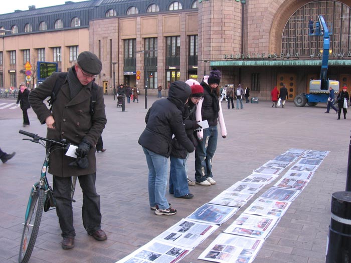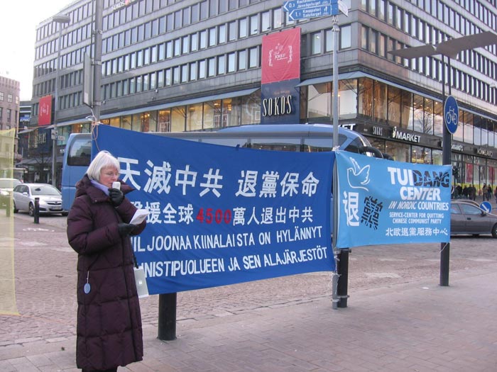 四年来,《·九·评*共产党》在海内外广为流传、被翻译成多种文字,超过四千五百万中国人的“三:退.”大潮已波及世界各地,不仅触及了海内外华人,也唤醒了很多不同肤色、不同语言、身处不同国度的西人。善良的芬兰民众不仅踊跃接资料,了解真相,更有很多人主动伸出援手声援中国民众的退!党!大潮、制止中共迫害法轮功。