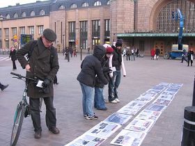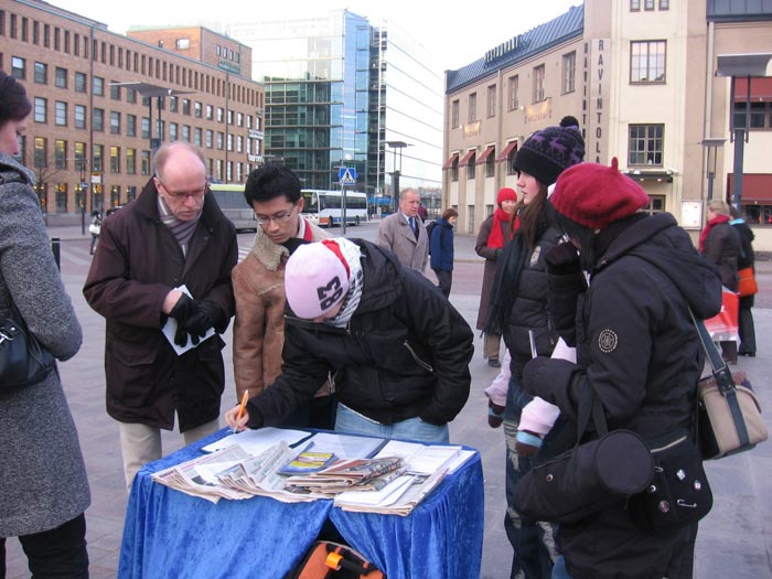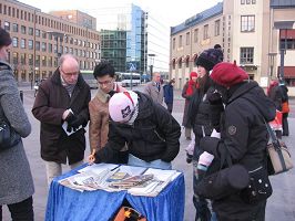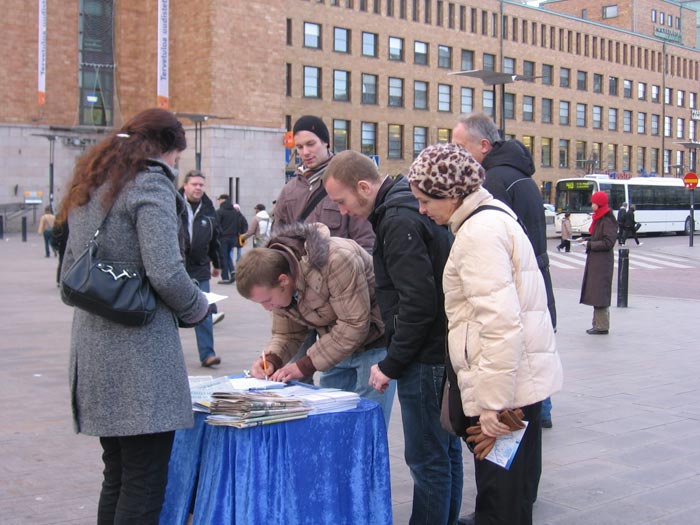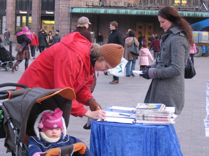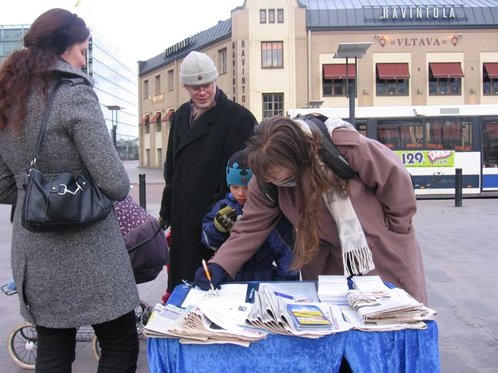 当天是赫尔辛基入冬以来最冷的一天,真有点寒风刺骨的感觉。法轮功学员Sinikka用芬兰语,借助扩音器,一遍遍向芬兰民众讲解《·九·评*共产党》及由此而引起的退!党!大潮、揭露着中共的杀人本性和对法轮功学员的残酷迫害、呼吁人们在天灭中共之时为自己选择好的未来。其他义工和学员则面带笑容,真诚的将宣传《·九·评*》和揭露中共活体摘取法轮功学员器官的资料呈递给过往民众。推着婴幼儿的父母、结伴而来的年轻人、合家同行的过路者等纷纷签名声援退!党!潮和制止中共迫害法轮功。
