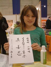今年的健康博览会上,除了有法轮功功法表演和揭露中共在中国迫害法轮功的真相资料及反迫害征签表外,还有擅长书法的法轮功学员现场演示中国书法,并把写有“法轮大法好”、“生命需要真善忍”的作品送给与会的有缘人。
