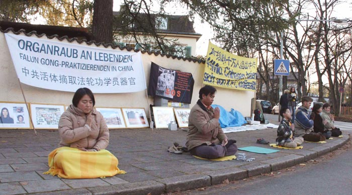 【明慧网二零零八年十一月三日】(明慧记者德祥慕尼黑报道)二零零八年十一月一日,德国慕尼黑法轮功学员在中领馆前举行活动,揭露中共对法轮功的残酷。写有“中共活体摘取法轮功学员的器官”、“声援四千四百万人退出中共”字样的横幅、法轮功学员祥和的炼功场景和图片展吸引了过往游客的脚步,他们不断询问中共迫害法轮功的真相,仔细观看展示法轮大法洪传世界、中共邪