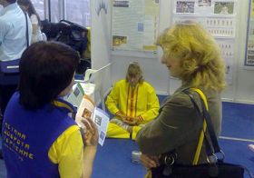 展会现场人山人海,所见之处,几乎人手一份法轮大法真相资料。面对心存“真善忍”的大法弟子,人们露出了理解和感激的微笑。