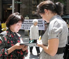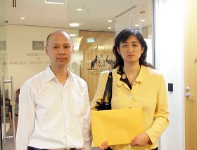 ![]() 法轮大法协会代表赵女士、李先生向外交部、移民部递交信件,要求拒绝让人权罪犯周永康进入澳洲。 |