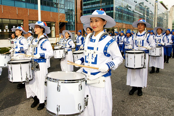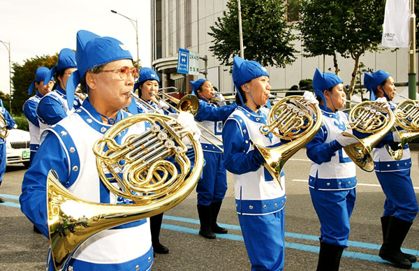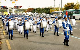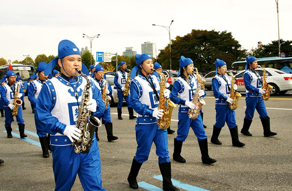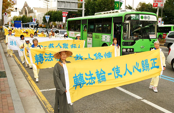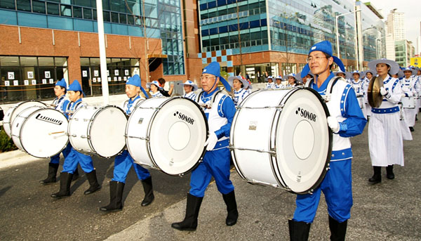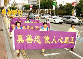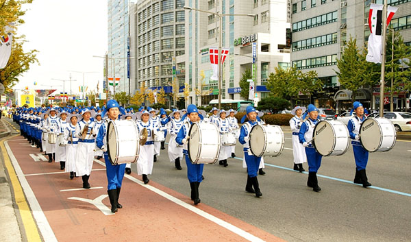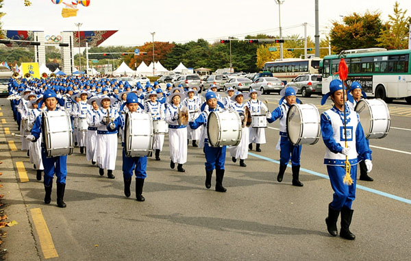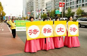 【明慧网二零零八年十一月五日】来自台湾、香港、日本、新加坡、马来西亚等地的一千五百多名法轮功学员,十一月一日,参加了在韩国举办的二零零八年亚洲法轮大法修炼心得交流会。次日,法轮功学员在韩国首尔奥林匹克大道上举行了盛大的游行。法轮功学员组成的“亚洲天国乐团”在前开道,游行队伍中间穿插着富有中国民间特色的“腰鼓队”、“仙女舞”、还有韩国特色的鼓乐队。放眼望去,整个游行队伍象一条舞动的彩色巨龙。