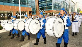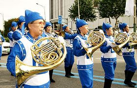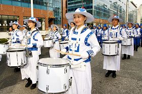 为这支游行队伍开道的“亚洲天国乐团”让观众惊羡不已,沿途观众争相拍照并与乐团合影。“亚太天国乐团”的一百六十名成员大多是来自台湾、日本、新加坡、韩国等地的华裔法轮功学员。台湾天国乐团负责人洪尧纹表示,台湾天国乐团成立两年,有五百多成员,这次来了四十名团员。