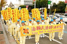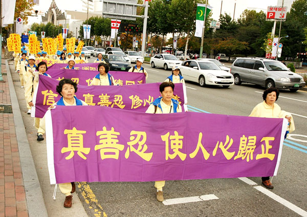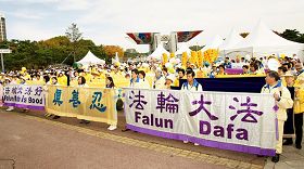 游行途中,有两名从大陆来的中国人跟着游行队伍一路走来,其中一位姓白的男青年说:“在国内相信了中共宣传的那一套,对法轮功很反感。但我来到韩国后,我看过自焚真相图片等资料,我还交了一个炼法轮功的朋友,人很好。现在我认为法轮功就是好,今天我看了这个盛大的游行,再一次对共产党对我们的欺骗感到很气愤……。”