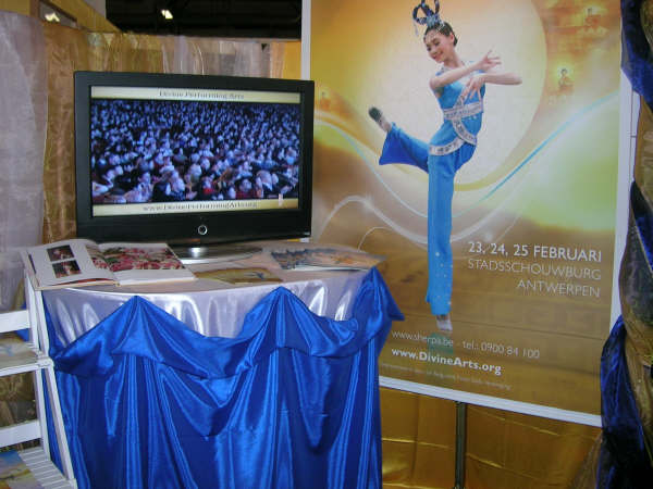 法轮功的展位摆满了有关法轮功的简介和真相资料。一些学员为参观者演示五套功法,一些学员教参观者叠纸莲花的方法,其他学员则送发中共在中国迫害法轮功的真相材料,以及将在安特卫普市(Antwerp)上演的神韵晚会的简介。学员们还两次在节庆活动的大舞台上展示法轮功功法。