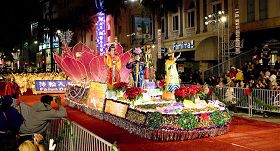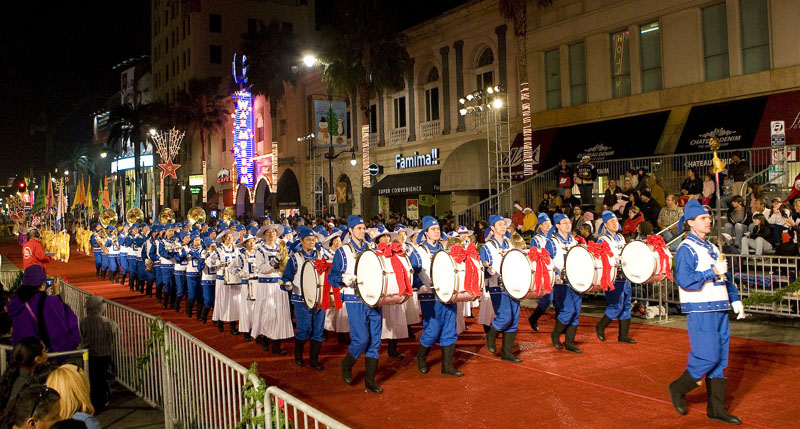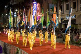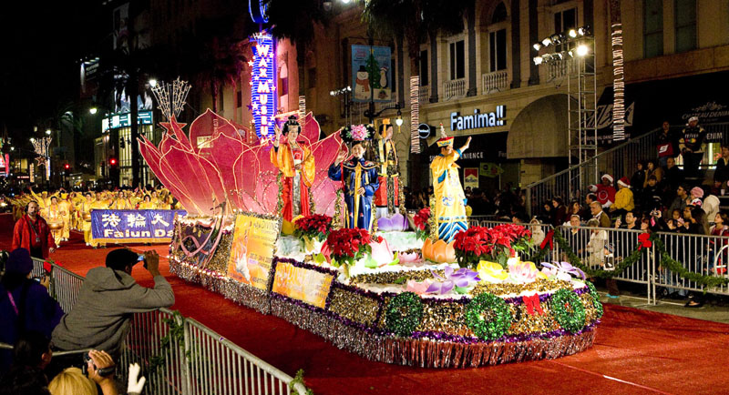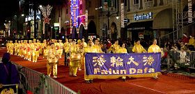 ![]() 在好莱坞圣诞游行中,盛大的法轮功队伍引人注目。 |