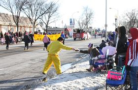 【明慧网二零零八年十二月十日】二零零八年十二月七日星期天下午,美国密西根州罗彻斯特(Rochester)市中心鼓乐齐鸣、欢声震天。寒冷的天气和萧条的经济并没有影响人们参与该市第五十七届圣诞大游行的心情。与往年一样,游行队伍由各行各业的男女老少组成形形色色的方阵,在市长的带领下,穿过整个市中心,受到沿途观众的欢迎。法轮功作为唯一的亚裔团体再次应邀参加圣诞大游行。宣传神韵晚会的花车首次展现在罗彻斯特市市民面前,给人们送上新年的祝福。