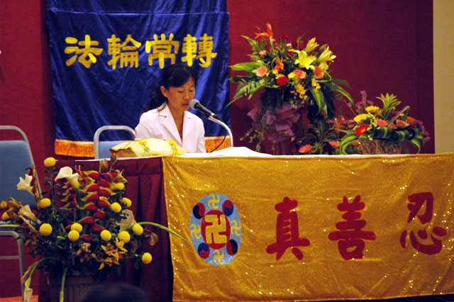二十位法轮功学员上台分享了他们的修炼体会。他们大部份都提到了自己如何在旅游景点向中国游客和本地华人讲真相,在面对常人的无理和专横时如何提高自己的心性,让更多的众生明白真相。