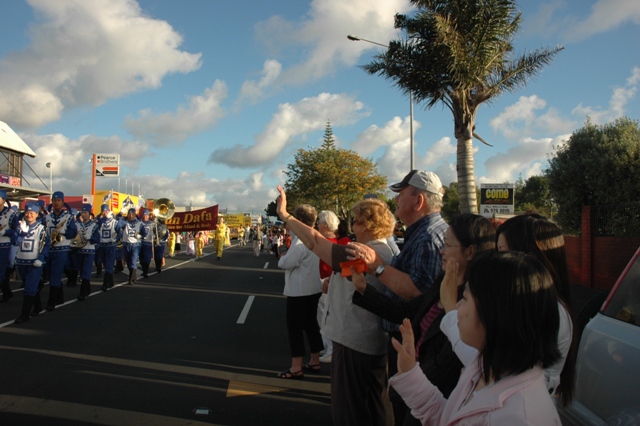 奥克兰市是新西兰最大城市,每年圣诞节各个地区都组织自己的圣诞游行,而且都吸引至少上万人前来观赏。在各个区的游行中,法轮功的游行队伍经过时,观众们纷纷鼓掌或挥手表示欢迎。