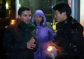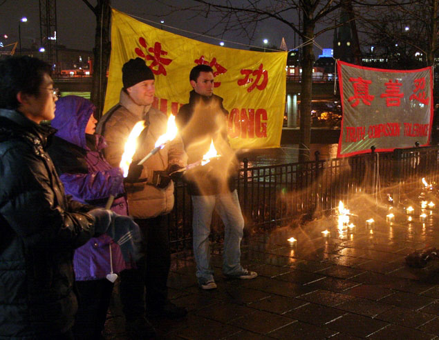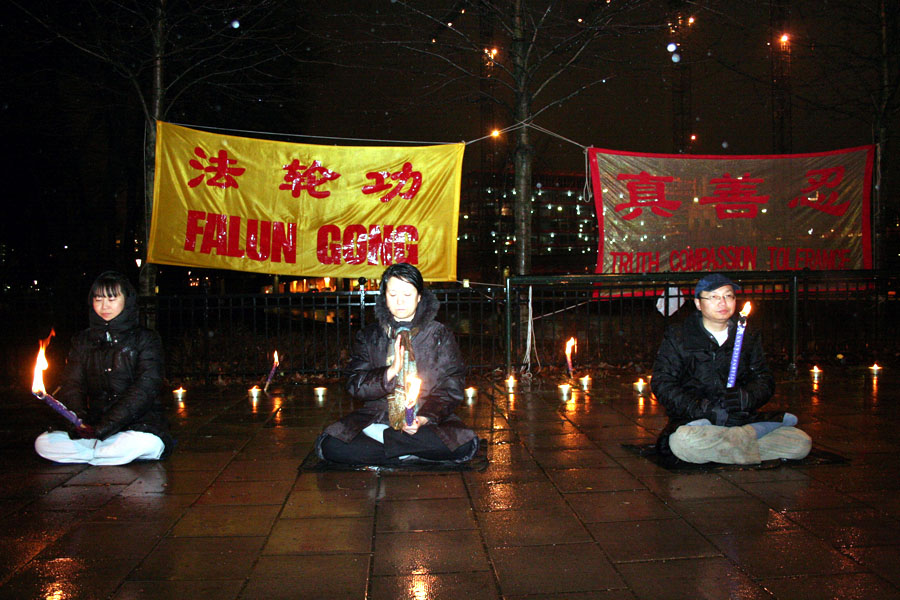 当天晚上的天气是风、雪、雨交加,学员们静静的在风雪中屹然不动。夜色中,烛光和篝火把“法轮功 Falun Gong”、“真、善、忍”的横幅映照的格外耀眼。来自世界各地贵宾的专车从学员们前面缓缓的驶过。
