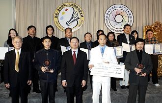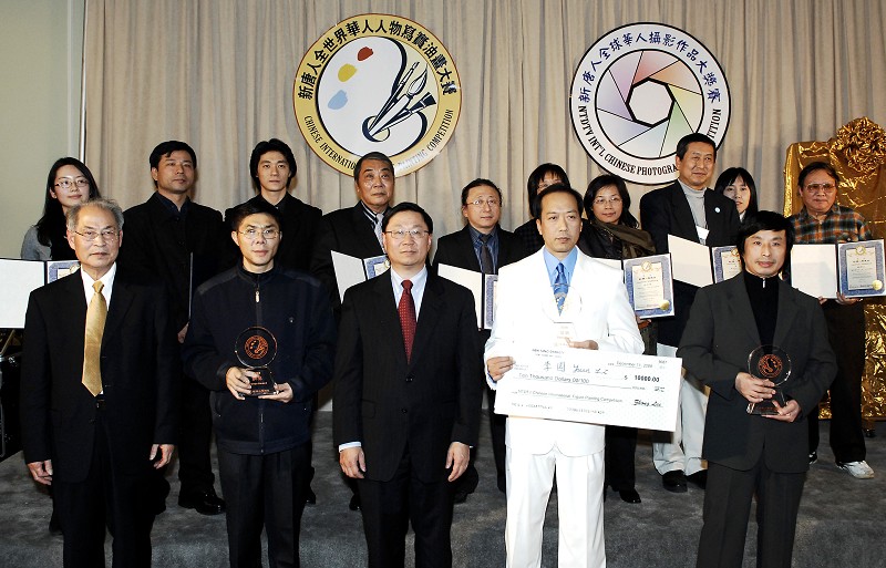![]() 首届华人油画大赛获奖者及油画大赛评委会主席张昆仑教授(前排左一)、新!唐!人:电视台总裁李琮先生(前排左三)合影 |