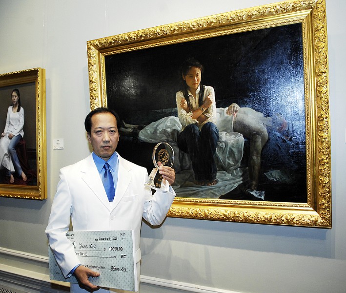 ![]() 写实油画金奖得主李园及其获奖作品──《蒙难在中原》,作品是很典型的十字构图,很强烈的表达作者的意思──一种悲伤;而且,画作散发出神圣的、一种内在的美的力量。 |
